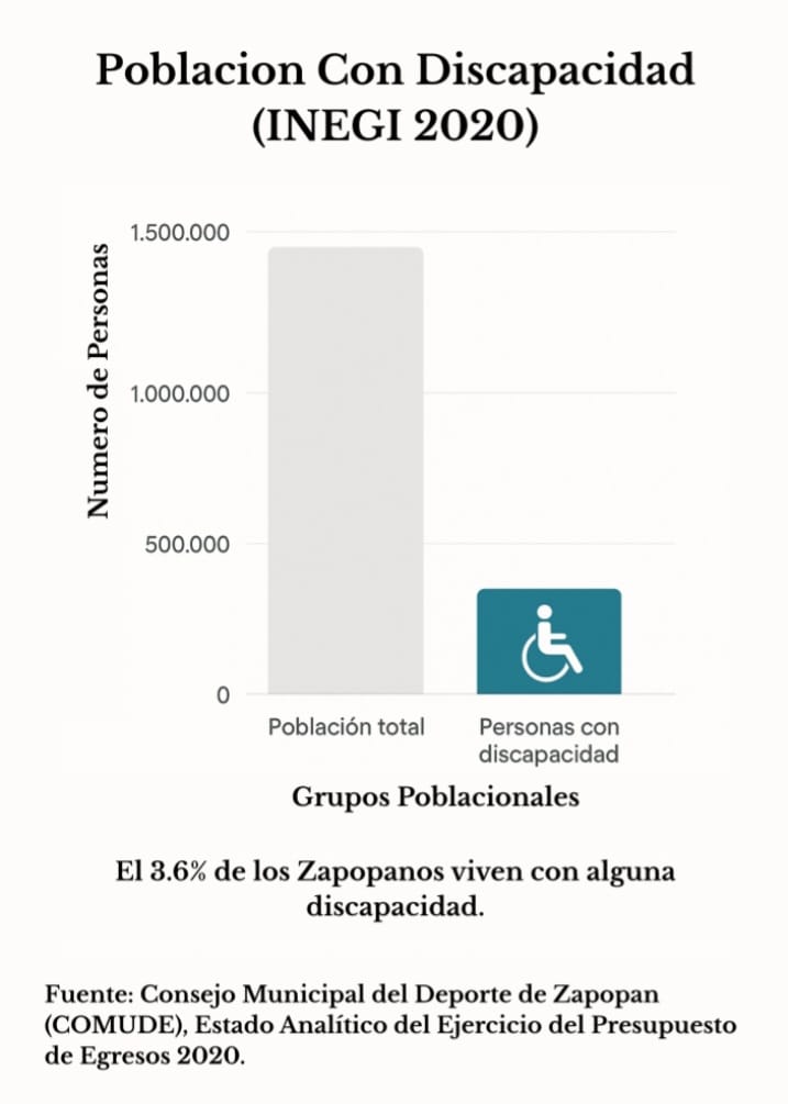 Esta gráfica muestra la proporción de personas con discapacidad en Zapopan según el Censo 2020. Aunque el municipio tiene cerca de un millón y medio de habitantes, solo alrededor de 54 mil viven con alguna discapacidad, lo que representa el 3.6 %. Este dato es clave para dimensionar el tamaño de la población que podría beneficiarse del deporte adaptado y que, sin embargo, permanece en gran medida fuera de la oferta pública deportiva
